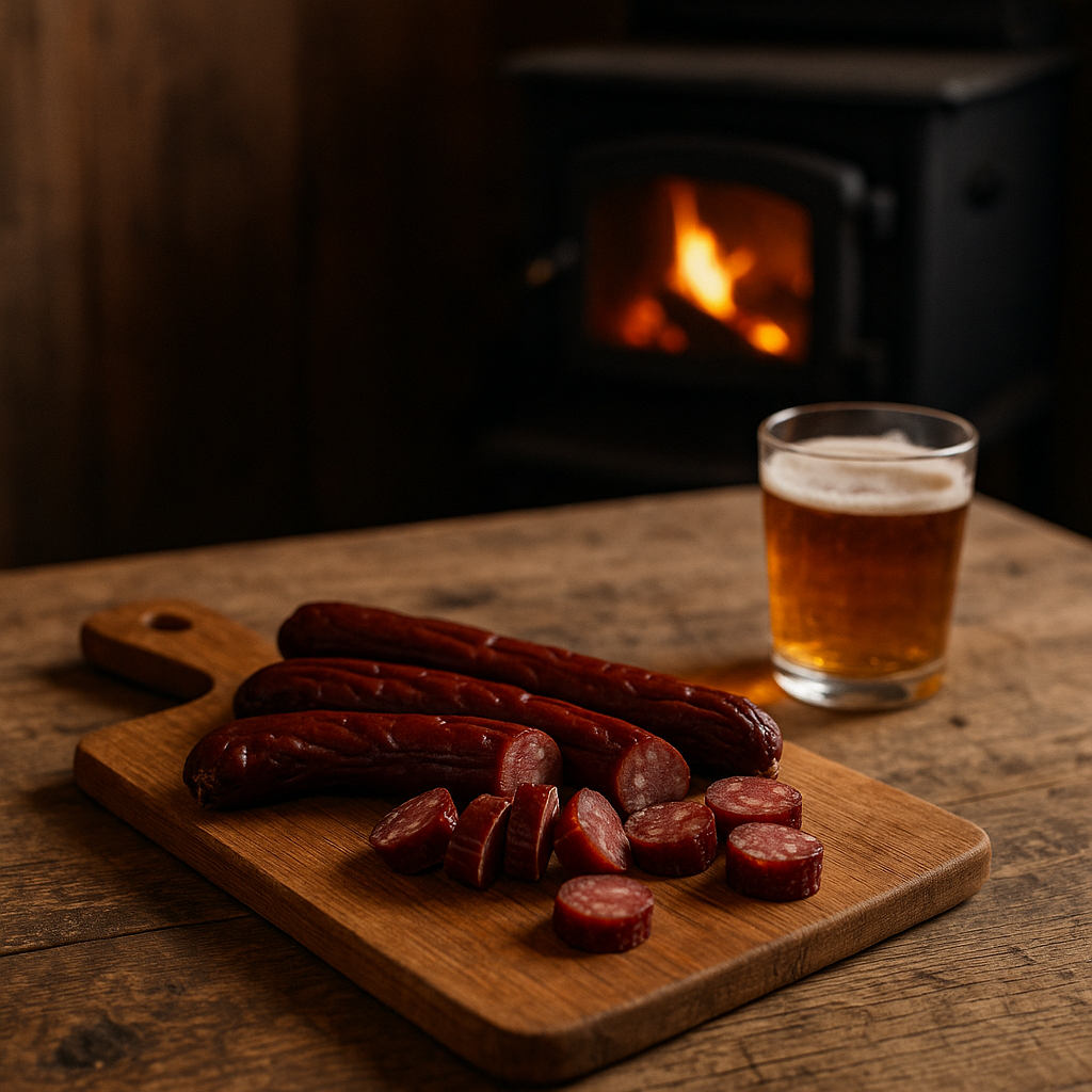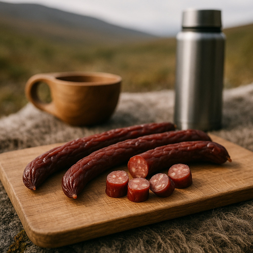 Vår ölkorv är gjord på kött från våra fjällkor här på Strömnäsgården i Norrbotten, djur som går ute hela året och bidrar till ett levande och regenerativt landskap. Köttet ger en fyllig grundsmak som bär upp kryddningen: vitlök, peppar och rök från alspån. Resultatet är en smakrik ölkorv med mild men tydlig smak, full av karaktär.